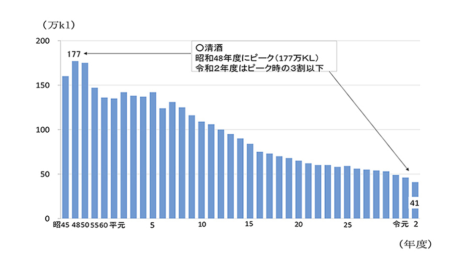 日本酒の需要は1973年をピークに下降し、今はピーク時の3割満たない出荷量となっています。酒蔵の数も、この40年で半減しました。