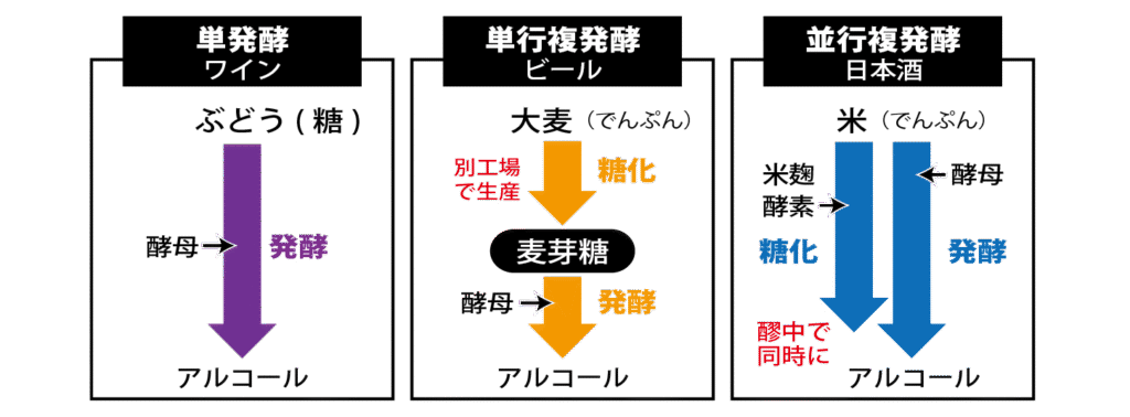 ビールは「単行複発酵」と呼び、予め麦芽のでんぷんを糖化させた後、酵母でアルコール発酵させます。糖化と発酵、それぞれ独立したプロセスで行います。
