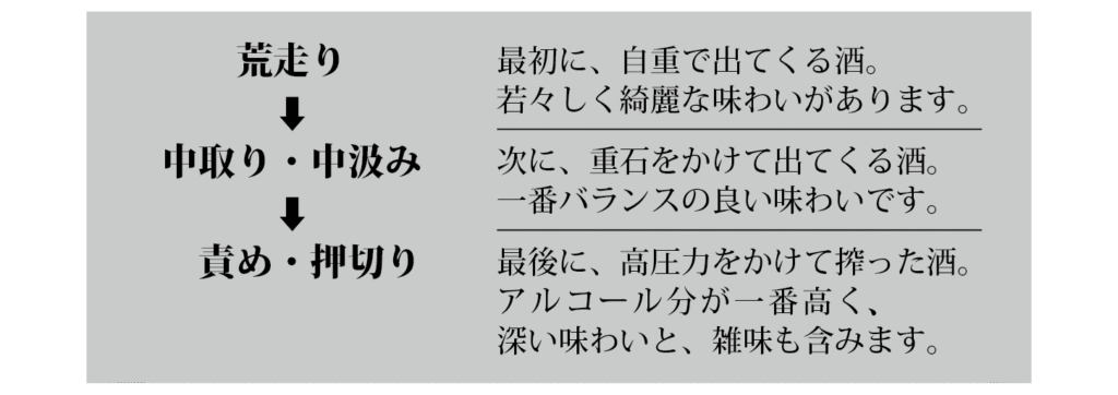 一般的には全てをブレンドしますが、吟醸酒や淡麗な酒には「責め」を含めません。