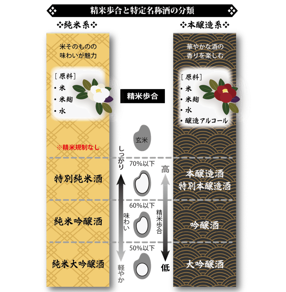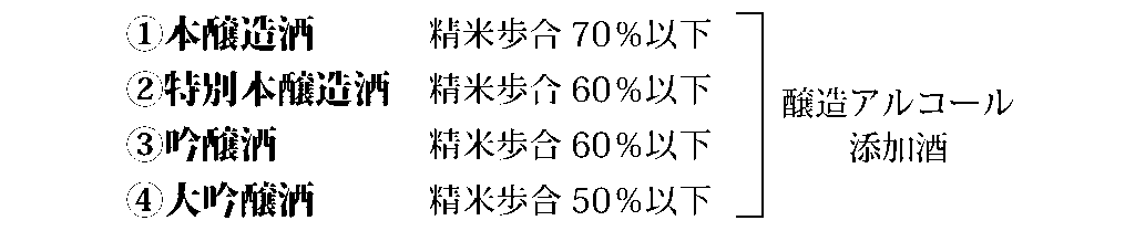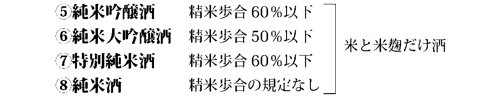「特定名称酒」とは、酒税法で使用する原料、酒米の等級、精米歩合、麹割合、製造方法、香味等要件が規定され、その違いによって8種類に分類され、麹米の使用割合は15%以上、それぞれ精米歩合を定めています。