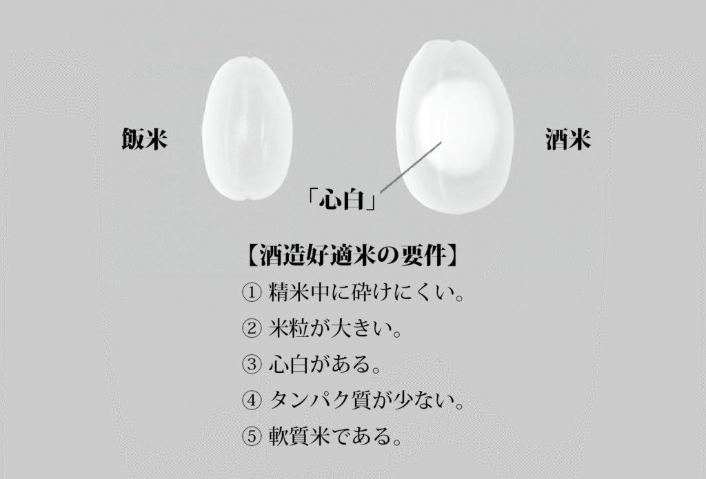 酒造業界では日本酒造りに適した米を「酒造好適米」や「酒米」と呼びますが、農水省の規程では「醸造用玄米」に分類し、食用の飯米の「うるち玄米」とは区分されています。酒米は飯米に比べると粒が大きく、米の中心に「心白」と呼ばれる隙間を持ったでんぷんの結晶が集積し、白く見えるのが特徴です。