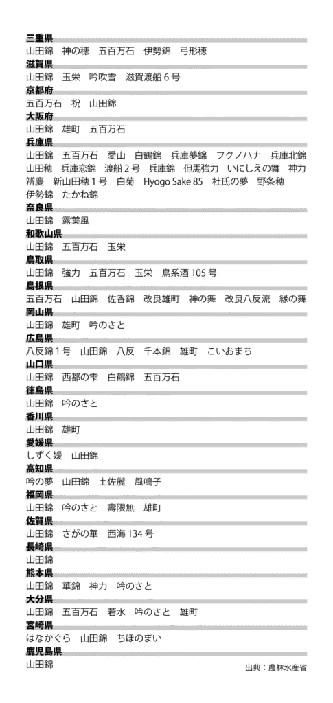 生産量第2位。米質が硬く、超高精米には不向き。大粒で心白もあり、蒸米は「外硬内軟」で麹はつくりやすく、米質が溶けにくい特徴から「淡麗辛口」の爽やかな酒質を生み出します。