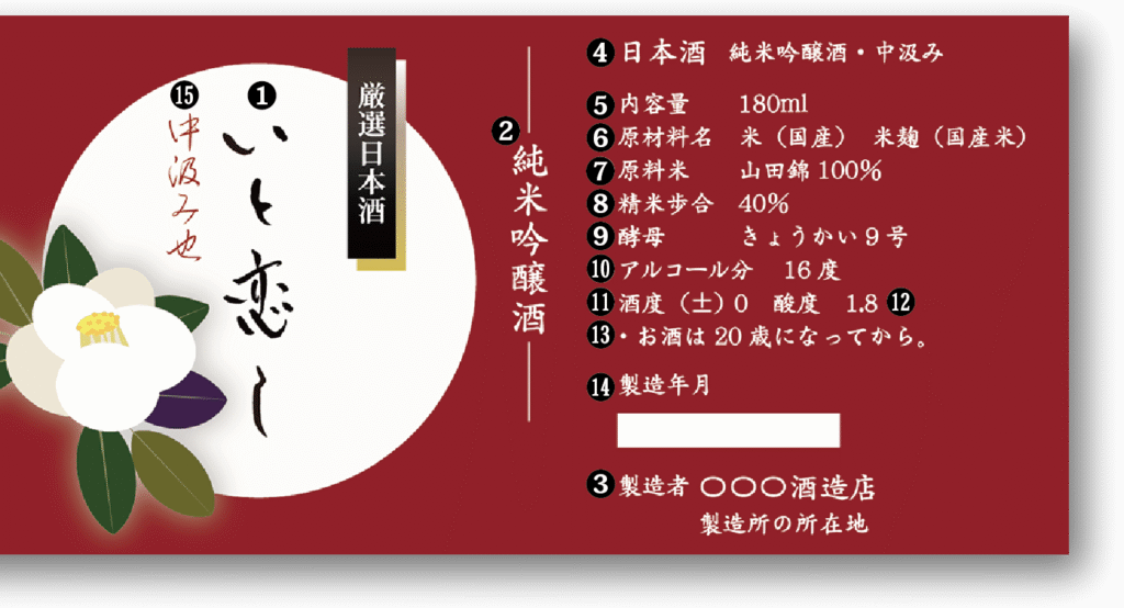 「日本酒のラベル」には、原材料名、品目、アルコール度数、製造時期、醸造所の名称と所在地、飲用上の注意、特定名称酒は精米歩合を必ず表記しなくてはなりません。