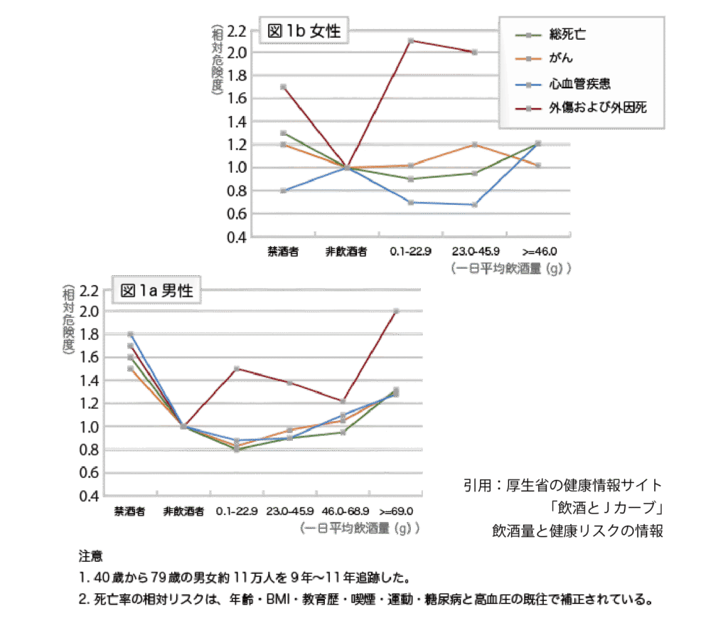 死亡リスクが最も低いのは、男女とも1 日平均23g 未満。日本酒にして1合弱の摂取量となります。